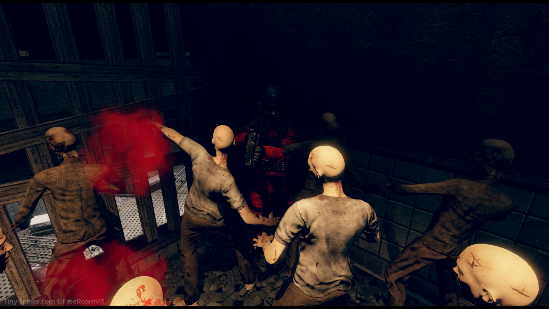 It is a game where you can walk around freely in a set area, you wear a high end computer backpack which is connected to the Oculus Rift headset. The headset and weapon have special markers on them which can be tracked by a motion capture system throughout the entire room.